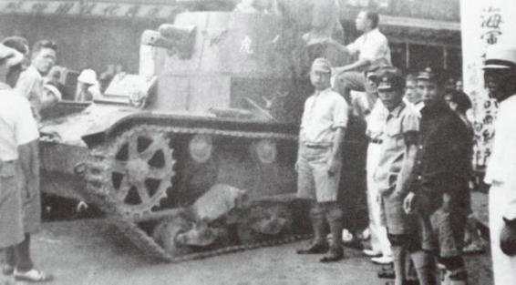 一辆冲入虹口日租界后被击中俘获的中国战车。“虎”标志表示它属于战车兵团第1营第2连,日军记载它的机枪手战死于车中,至死仍然保持射击姿势。