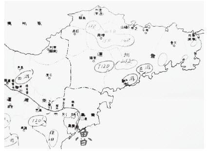 日本《华北治安战》中1942年的山东半岛,圆圈中是八路军的控制区和国民党军的控制区。桑岛在参加深入山区的扫荡作战时,也曾在墙壁上看到“中国国民党万岁”的标语,与“中国共产党万岁”的标语交相辉映。