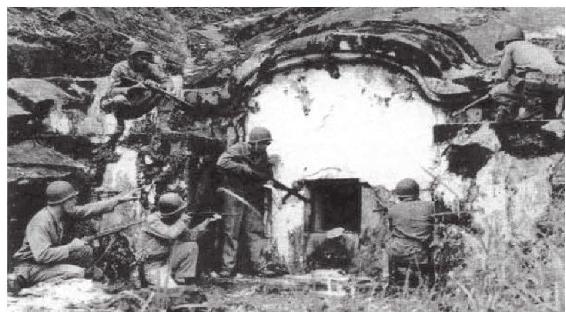 嘉数高地两面是山,中间呈马鞍形,上面长满野草、灌木和小树,乍一看,既不高也谈不上有多崎岖,但日军在高山上构筑的防线却令人叹为观止,其复杂和完善程度甚至超过了硫黄岛。