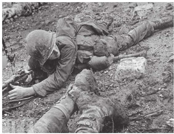 一名陆战队员说了几句风凉话,别的人急忙制止。经过类似贝里琉岛那样“最糟糕的战役”,大家早已充分体会到了战争的艰苦、冷酷和非人道。这里没有人性本善,没有孩子气的天真,如果最终能够活下来,即使身上再脏,样子再狼狈,都能算是幸运儿。