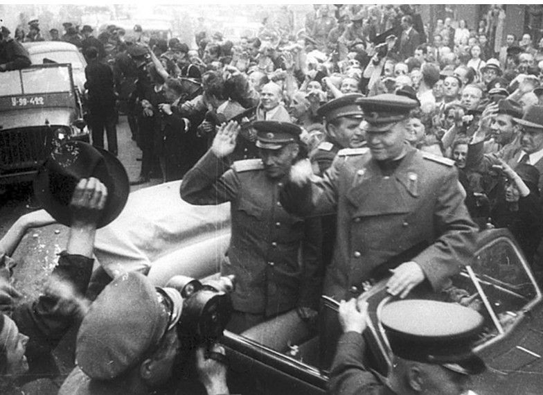 1945年,苏军解放布拉格后,科涅夫(车上前座站立者)受到捷克斯洛伐克人民的热烈欢迎。1月12日凌晨,科涅夫率领他的乌克兰第1方面军从桥头堡发起进攻,维斯瓦河战役正式打响。科涅夫让德军战俘走在前面,蹚过雷区,然后他们顺利地占领了德军前沿阵地。接下来,大量的火炮进行轰击,炮火的密集程度让人咋舌,几乎是一次毁灭性打击。德军看似坚固的防线瞬间崩溃,士兵来不及反击便纷纷投降。面对如此景象的后方德军,将其形容为“火山爆发”,“远远看去好似天塌下来一样”。有些被俘虏的士兵道出了当时的情景:在他们准备还击的时候,无数炮弹从天而降,他们只能趴在战壕里,很多人被厚厚的土埋了起来,昏了过去。当他们醒过来的时候,将军们早已逃往凯尔采镇,不知所终。
